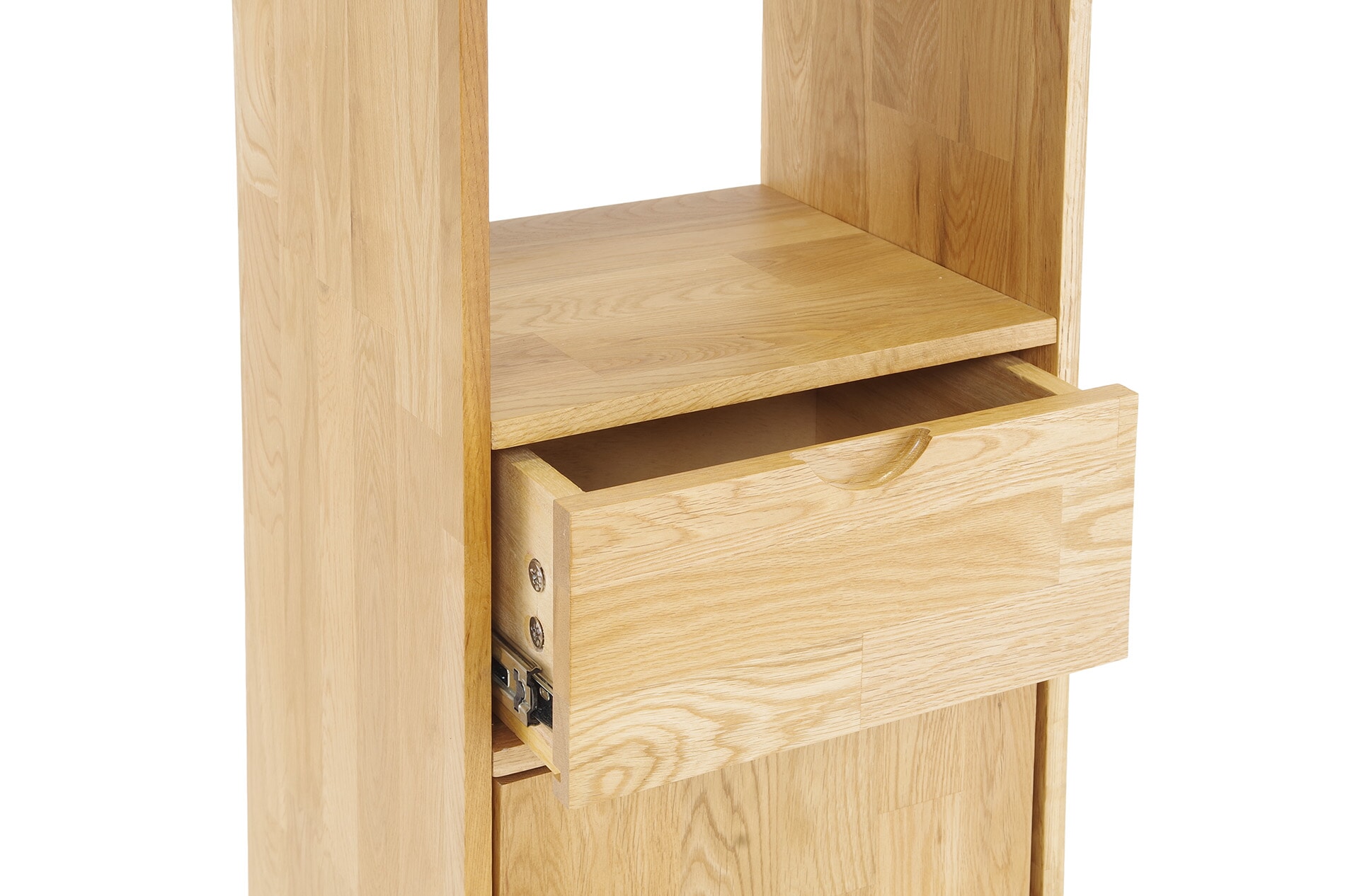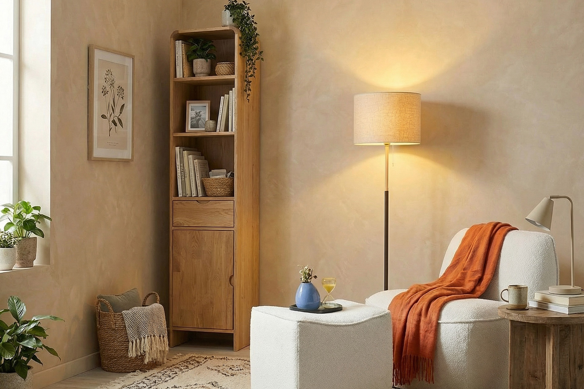 Crafted from natural oak, this tall cabinet balances open and closed storage to keep everyday essentials organised while maintaining a calm, uncluttered look.