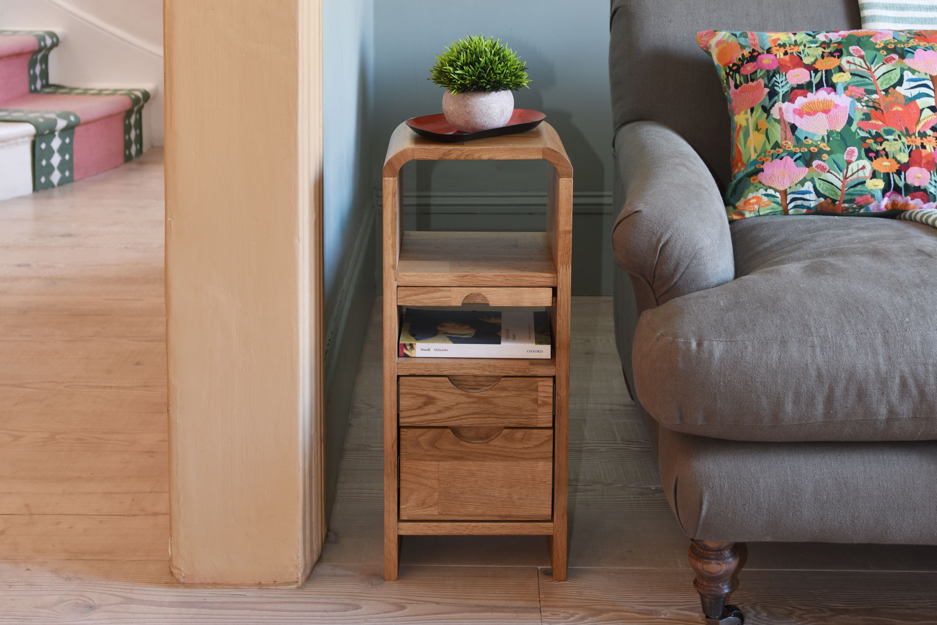 With its compact dimensions, it fits perfectly into smaller spaces while offering enough surface area to hold your night time necessities.