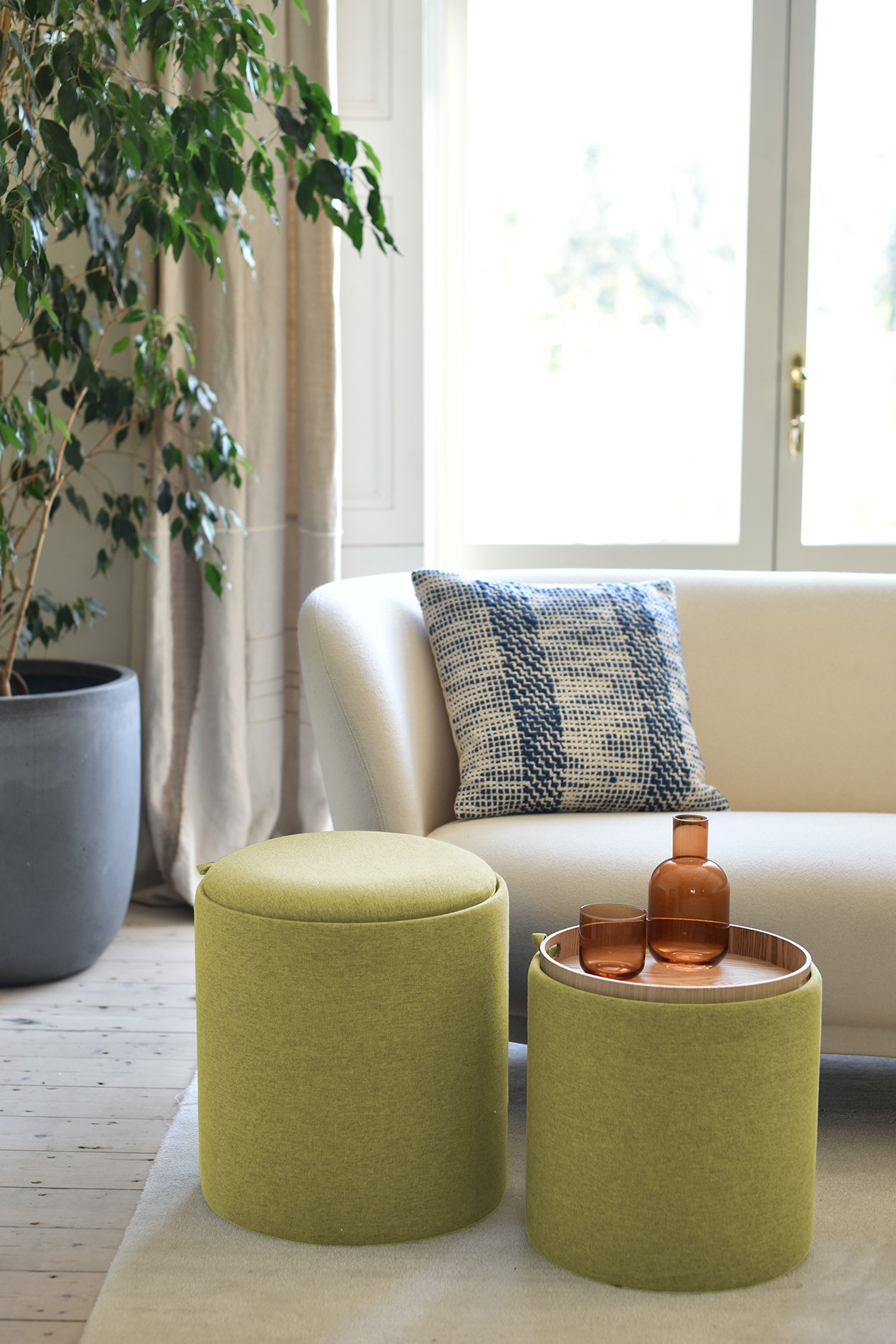 Upholstered, with lift off tops revealing hidden storage, these savvy little pieces slip easily under tables, benches, desks and are great for extra seating and it can also act as a table to set your book, magazine, or drinks.