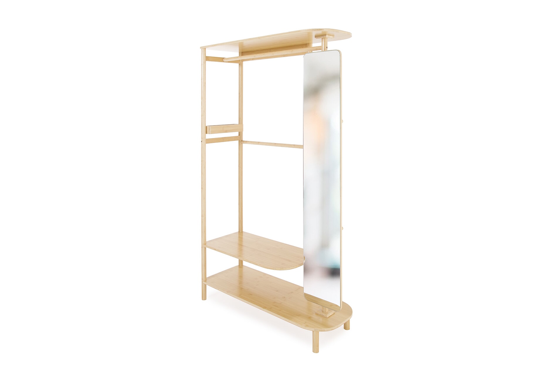 Its slim frame holds a full-length mirror on a rotating panel, revealing open hanging space and tiered shelving behind – perfect for keeping everyday outfits, accessories and shoes in easy reach.