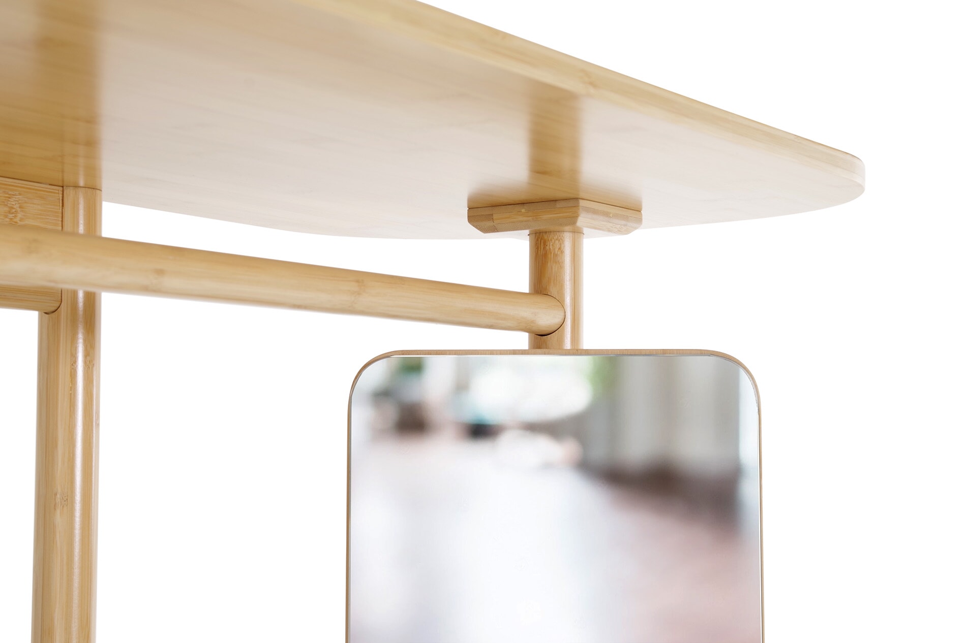 A clever blend of mirror, rail, shelves and side hooks makes this the ultimate multitasker for small bedrooms, hallways or guest spaces.