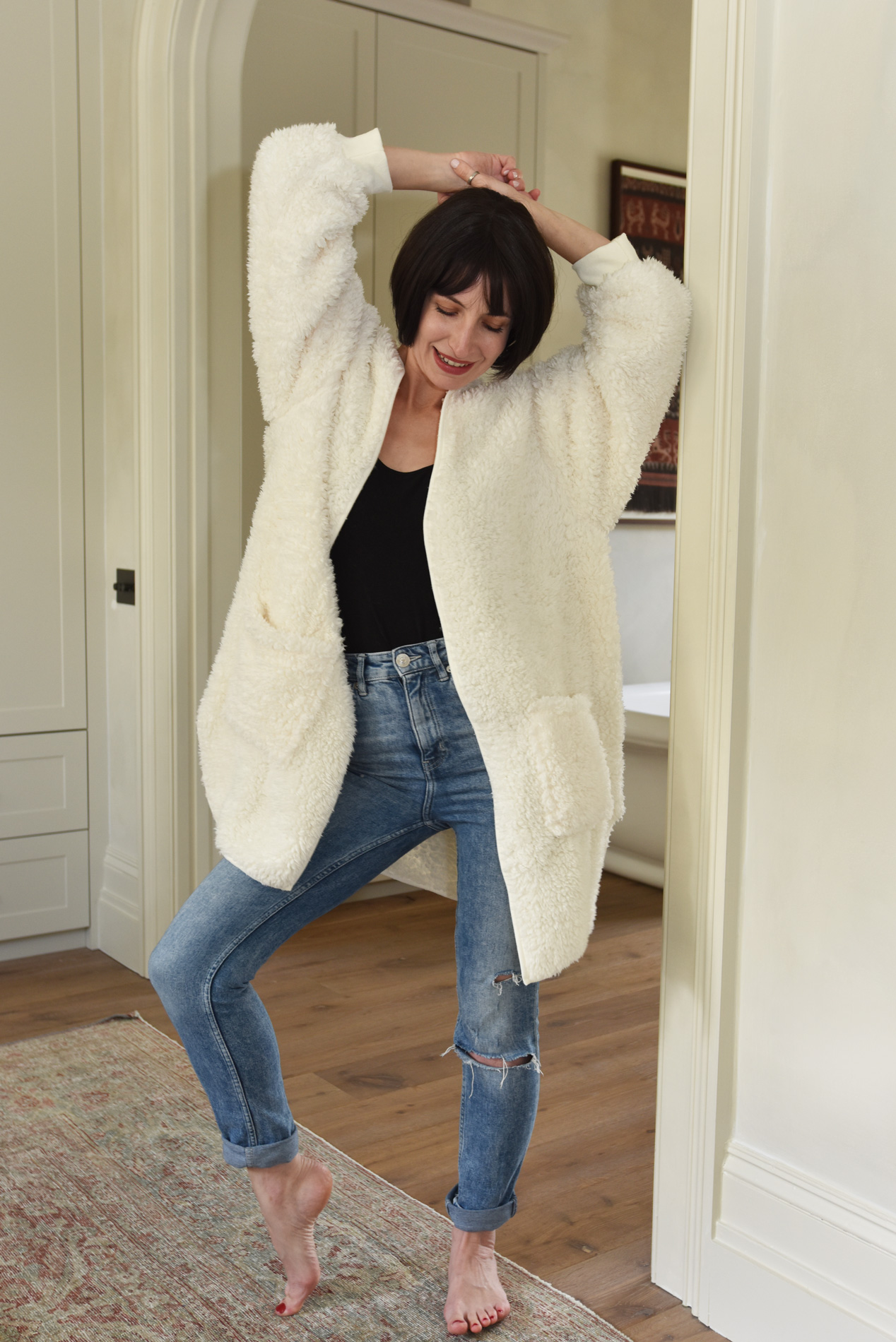 Home couture takes on a new meaning with this fabulously snuggly piece! Ideally designed for warmth, comfort, work, rest and play, this lush faux sherpa skeepskin loungewear is smart and snug at the same time.