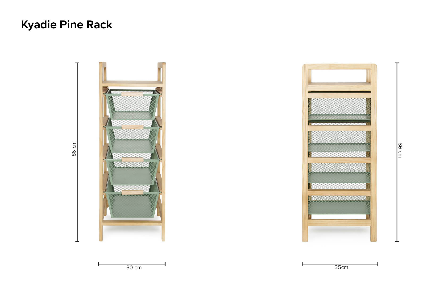 Add rustic charm and practical storage to your home with the Kyadie Pine Rack. Made from sturdy pine wood and featuring wire storage drawers, this piece combines natural texture with an industrial touch.