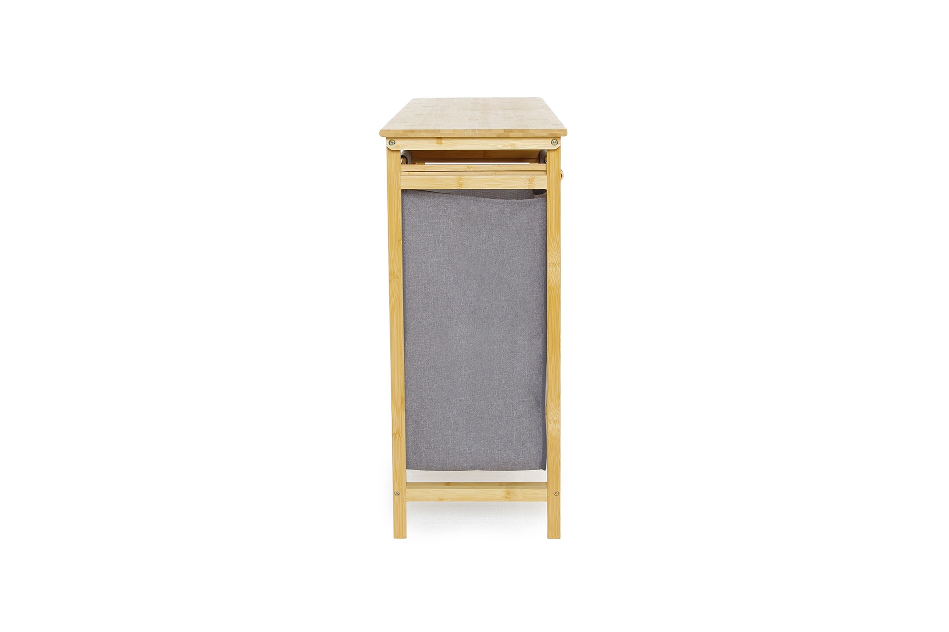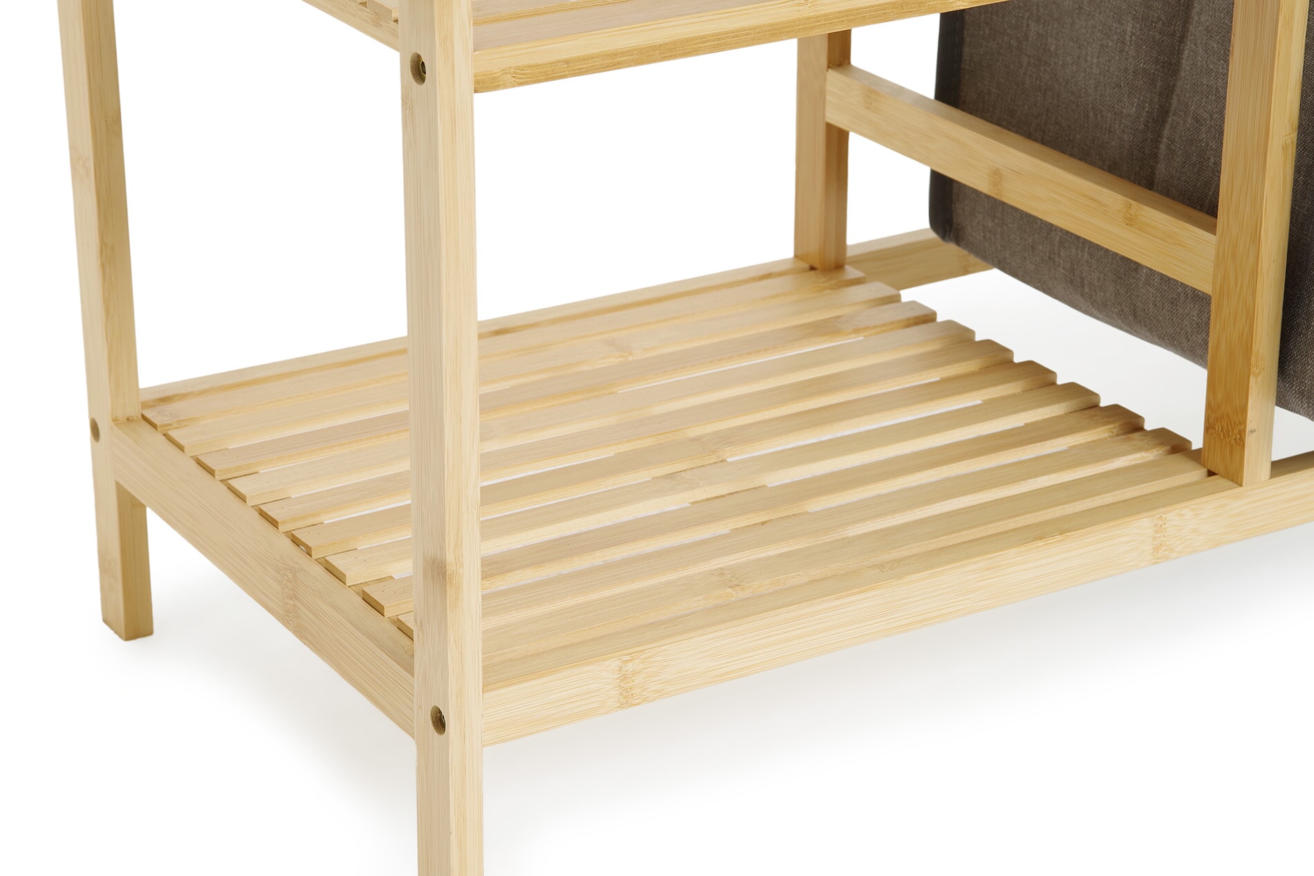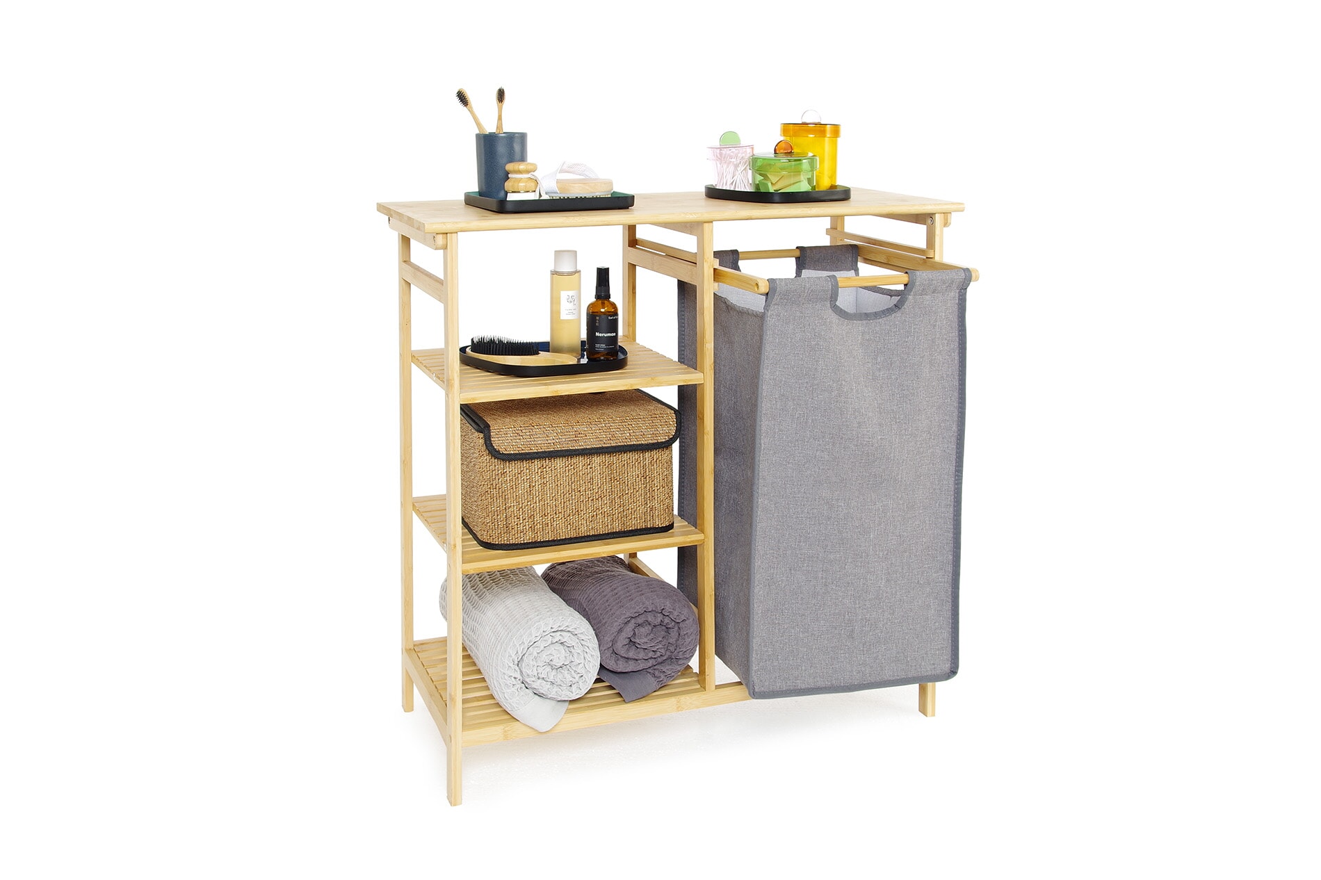 Crafted from natural bamboo for a warm look, this versatile unit features open shelving for towels, baskets, and toiletries, alongside a removable fabric laundry hamper for easy transport to the washing machine.