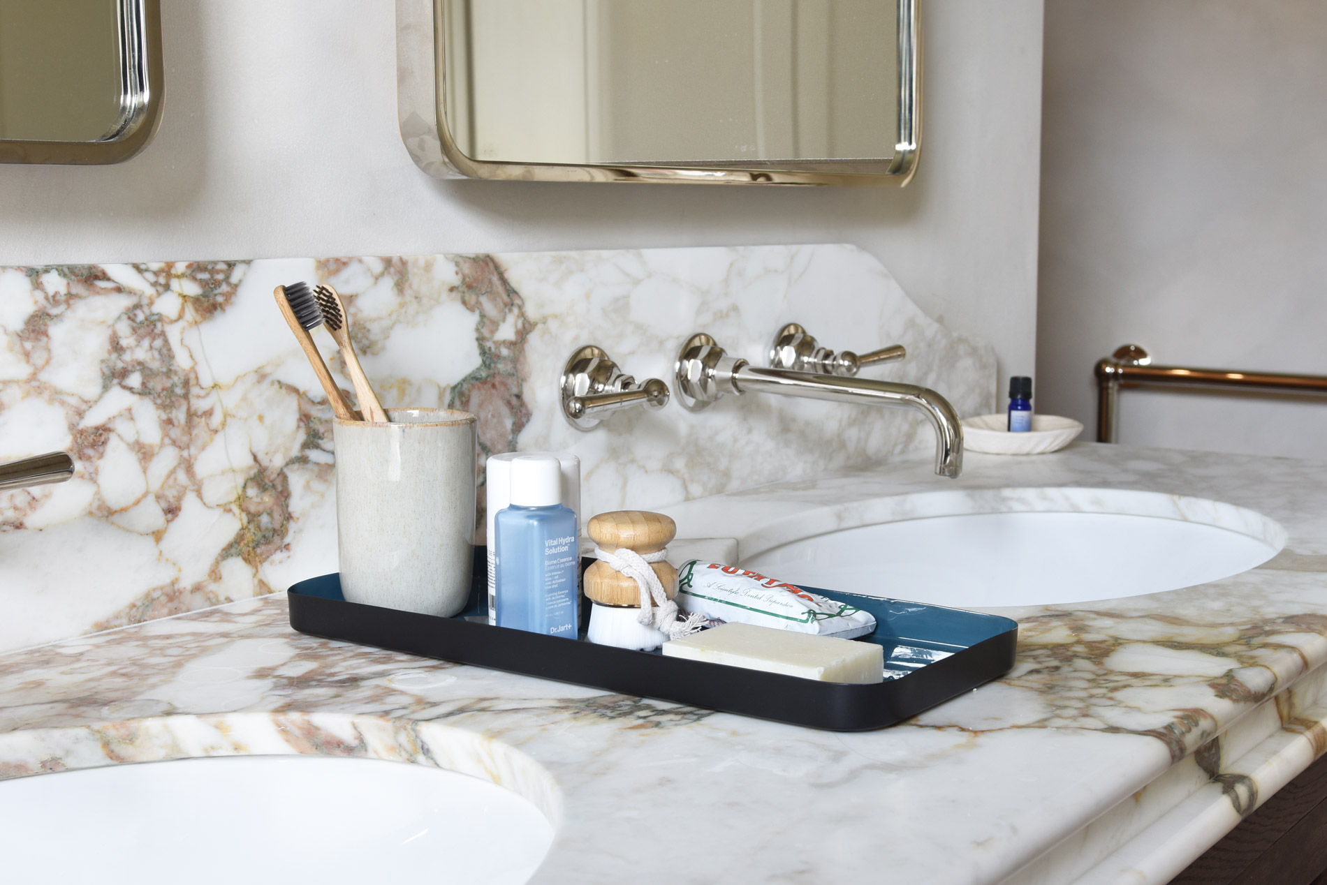 A smart metal tray with matt black on the outside and an enamelled colour on the inside, this modern marvel brings a new meaning to 'in tray' and is ideally designed to collate and store possessions.