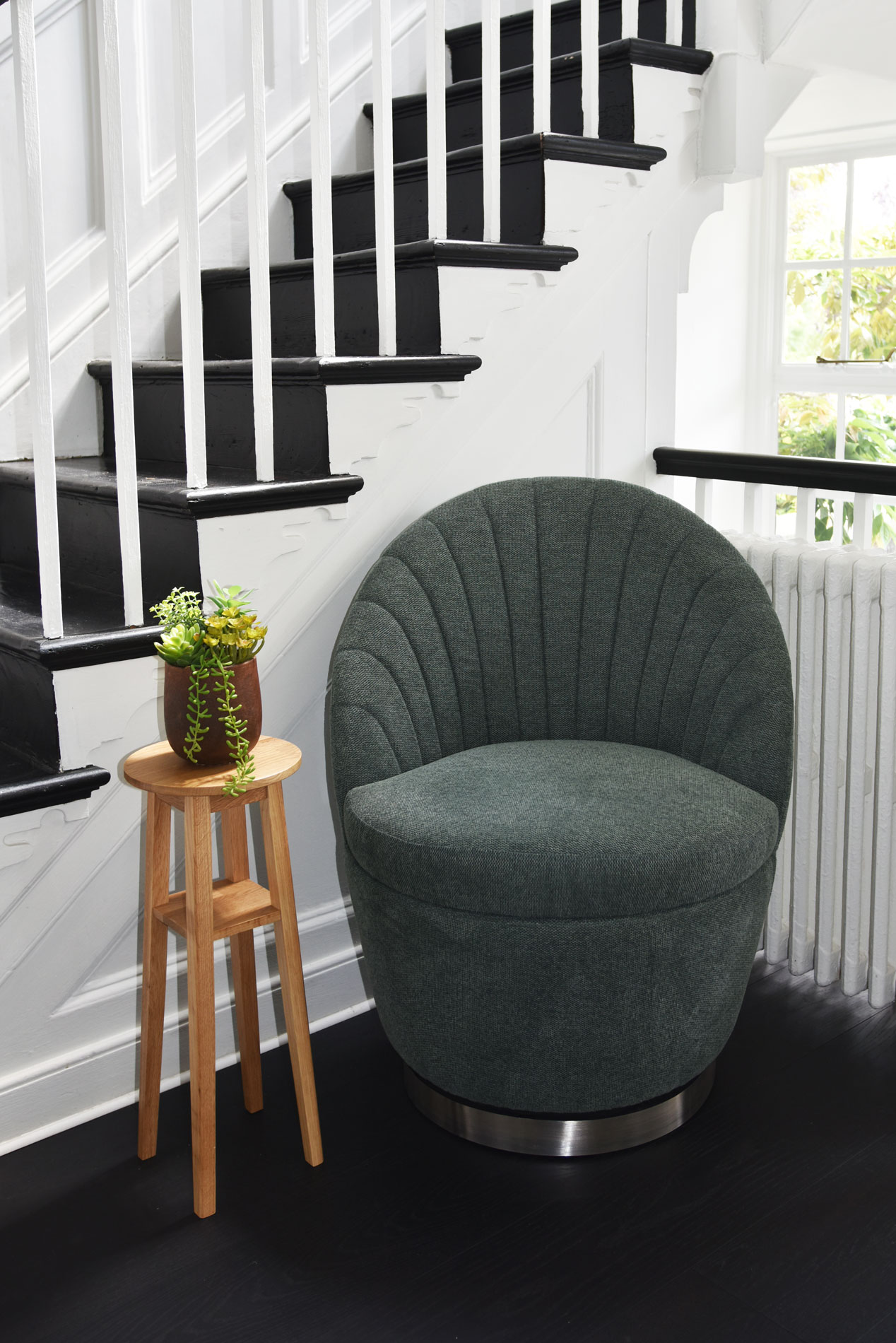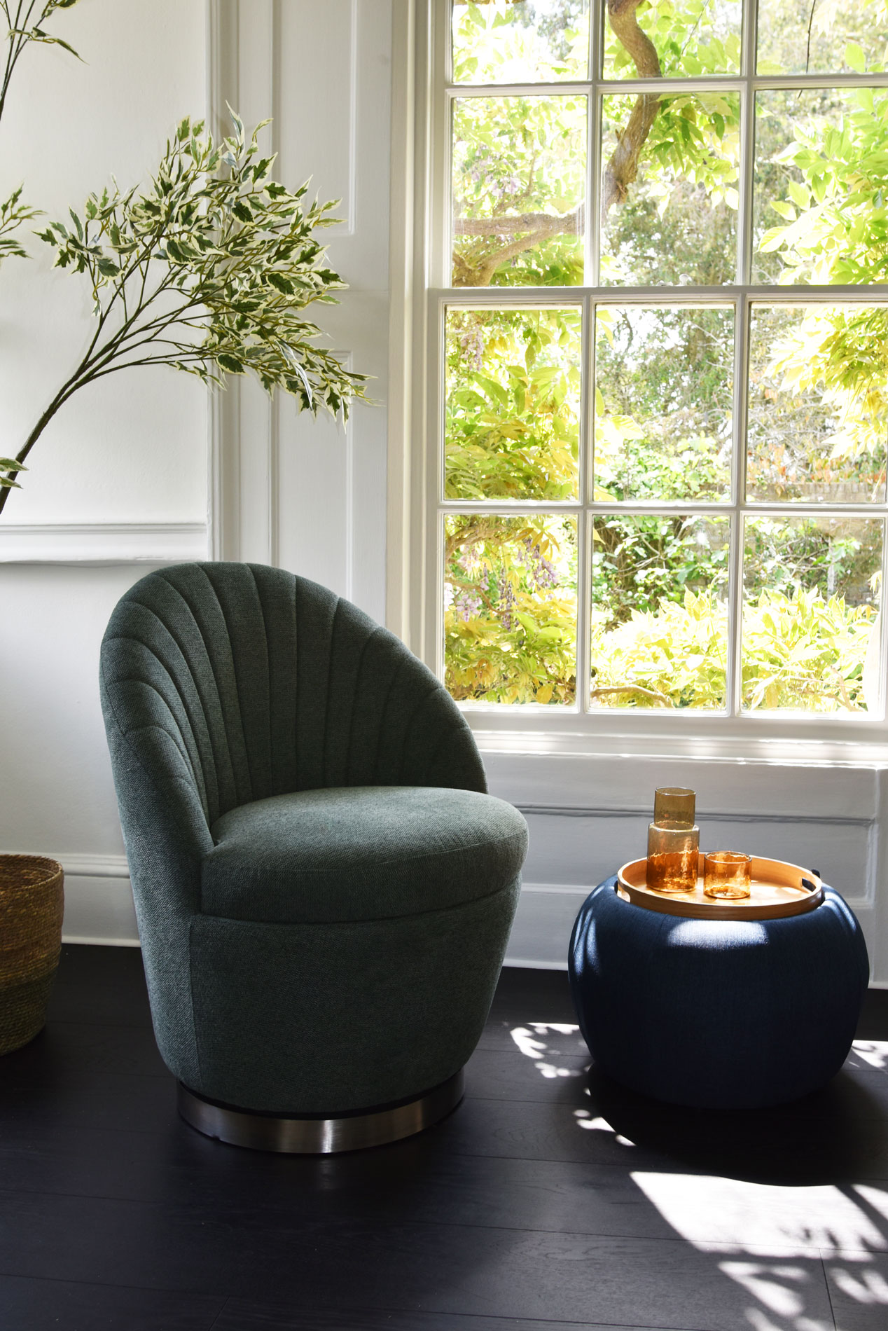 Its gently curved silhouette and swivel base create a modern, sculptural look that stands out in any room.